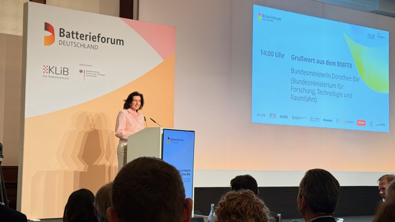 Das Batterieforum bringt Vertreter aus Industrie, Wissenschaft und Politik zusammen. Im Fokus stehen dabei neben aktuellen wissenschaftlich-technischen Entwicklungen auch strategische Fragestellungen sowie der fachliche Austausch zu zukünftigen Herausforderungen und Chancen der Batterietechnologie. Auch die Bundesministerin Dorothee Bär nahm an der Veranstaltung teil und stellte in diesem Rahmen die neue Hightech-Agena für die Batterieforschung in Deutschland vor.