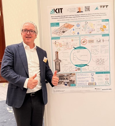 Foto: Professor Schabel präsentiert auf dem Poster “About Humidity Management and Post-Drying in Lithium-Ion Battery Production Processes – Simulations Combined with Unique Experiments and Techniques on Micro and Macro Scales“ die aktuellen Arbeiten der TFT am KIT von Philipp Barbig, Johannes Dörr und Thilo Heckmann zum Thema Feuchtemanagement und Nachtrocknung in der Batteriezellproduktion von Lithium-Ionen- und All-Solid-State-Batterien.