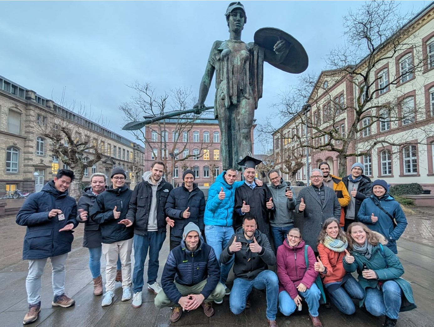 Foto nach Doktorprüfung P. Cavadini vor der Statue am KIT Ehrenhof mit TFT Alumni.