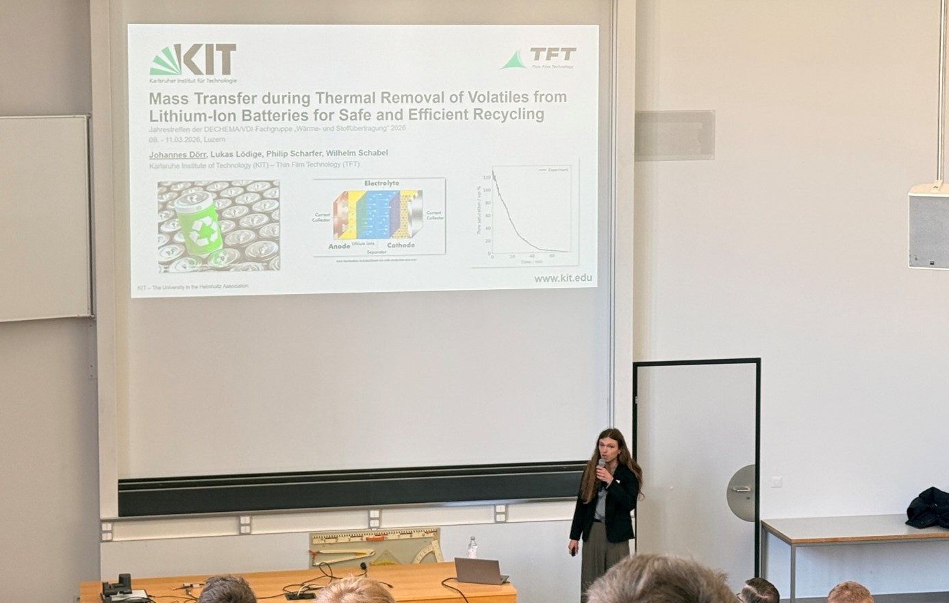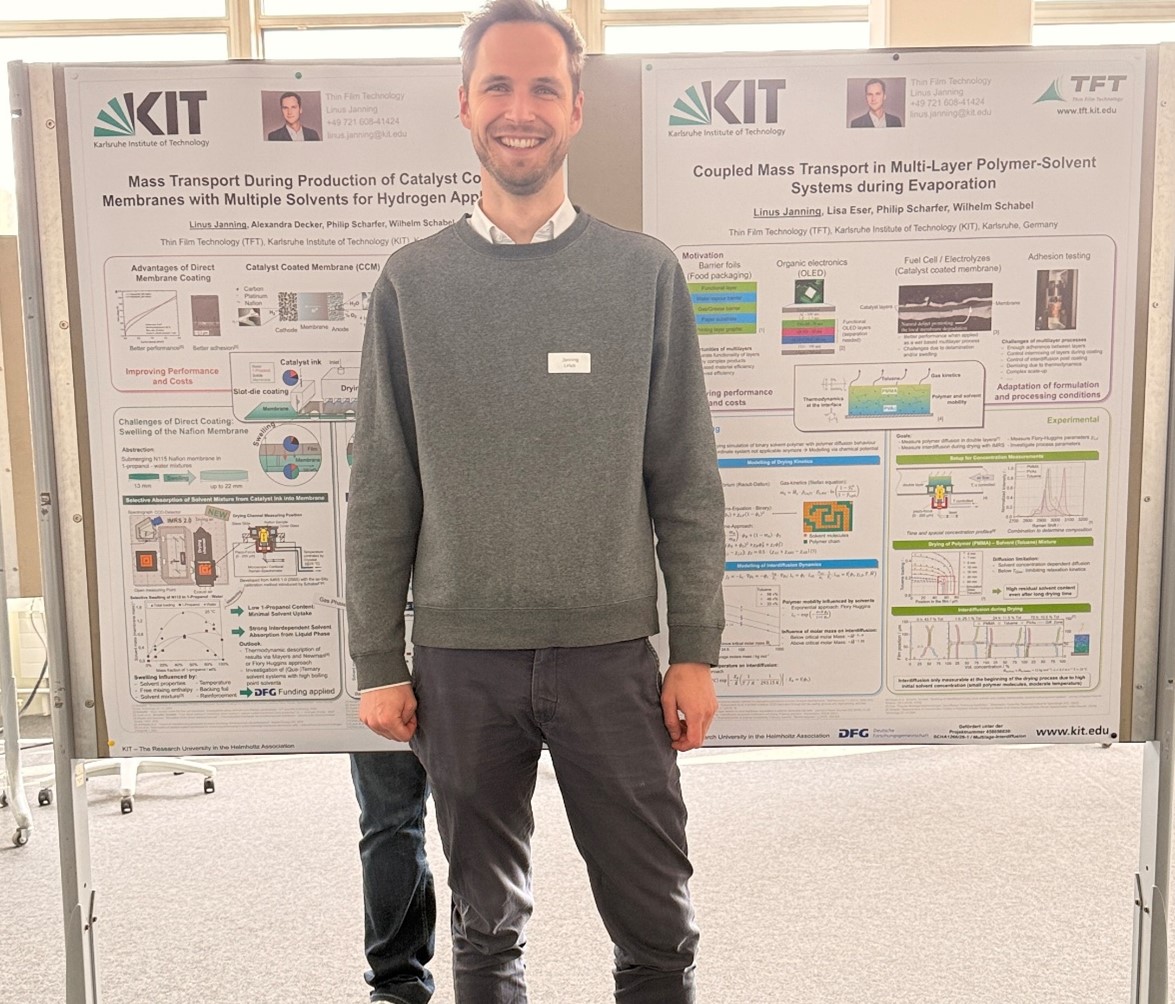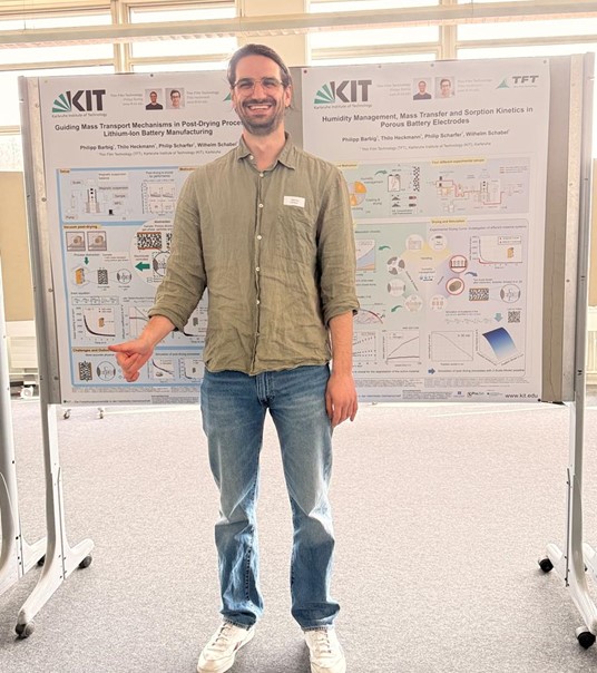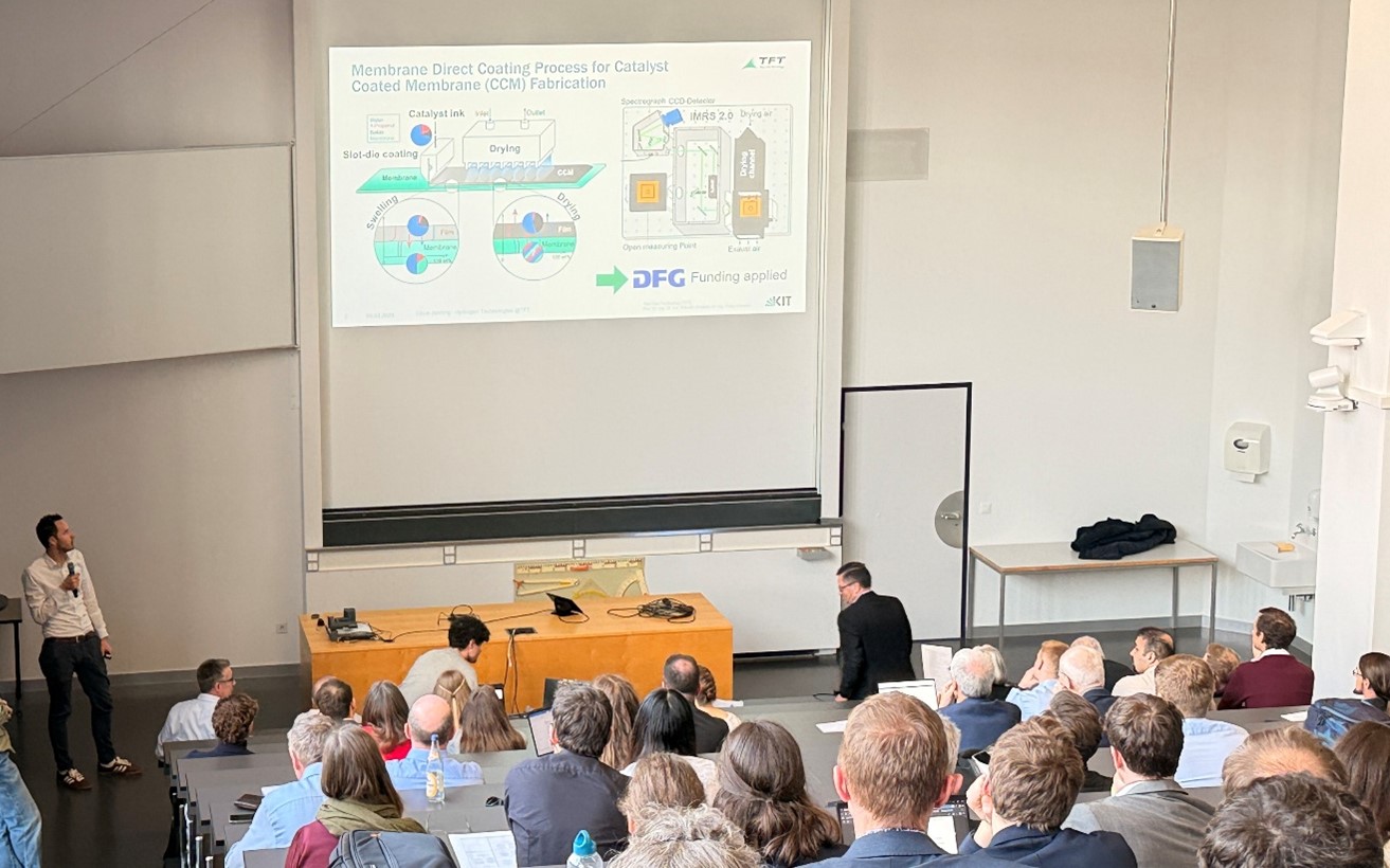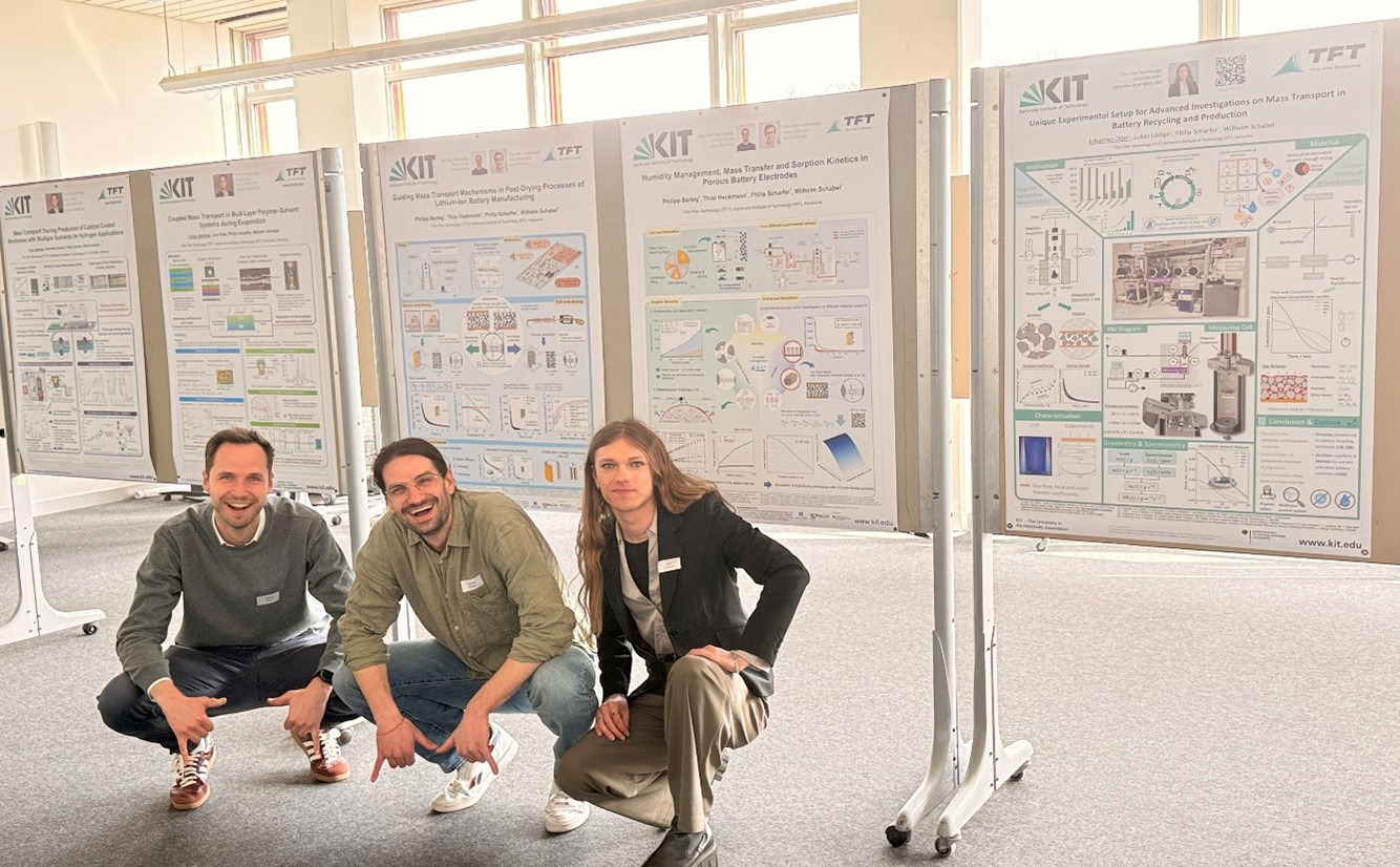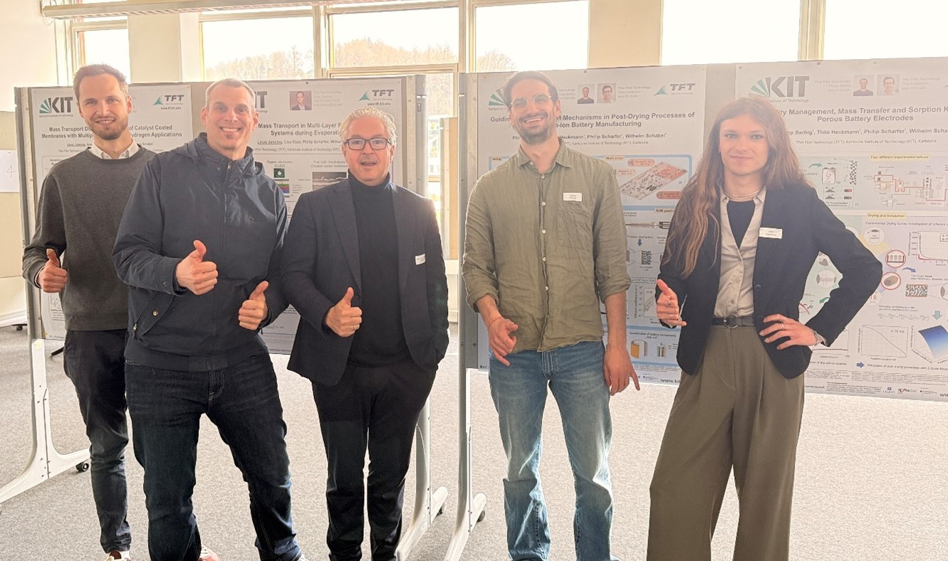 Mit insgesamt sechs Beiträgen, davon ein Vortrag und fünf Poster mit Kurzpräsentation, zeigten die Doktoranden der Thin Film Technology vom KIT ihre neuesten Forschungsergebnisse aus den Bereichen Batterieforschung, Elektrodentrocknung, Batterierecycling und Wasserstofftechnologien.