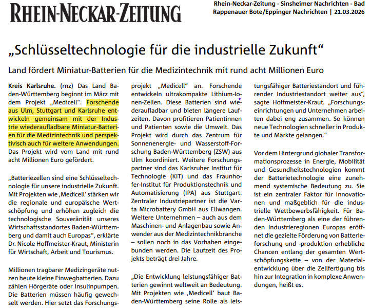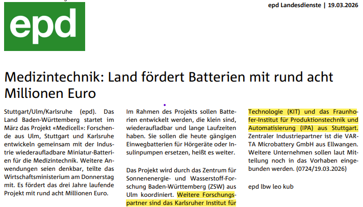 März 2026 - Wiederaufladbare Miniatur-Batteriezellen aus Baden-Württemberg für die Medizintechnik