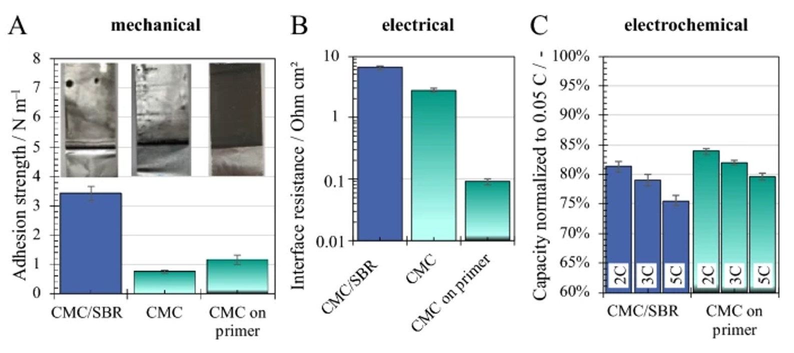 The results show that water-based processing can enable significantly higher drying rates while maintaining electrode properties. Especially the use of a simultaneous primer enables to reduce interface resistances. Together with our previous work on simultaneous primer coating for faster electrode drying, this is another step linking process and electrode design to achieve higher-throughput electrode manufacturing.